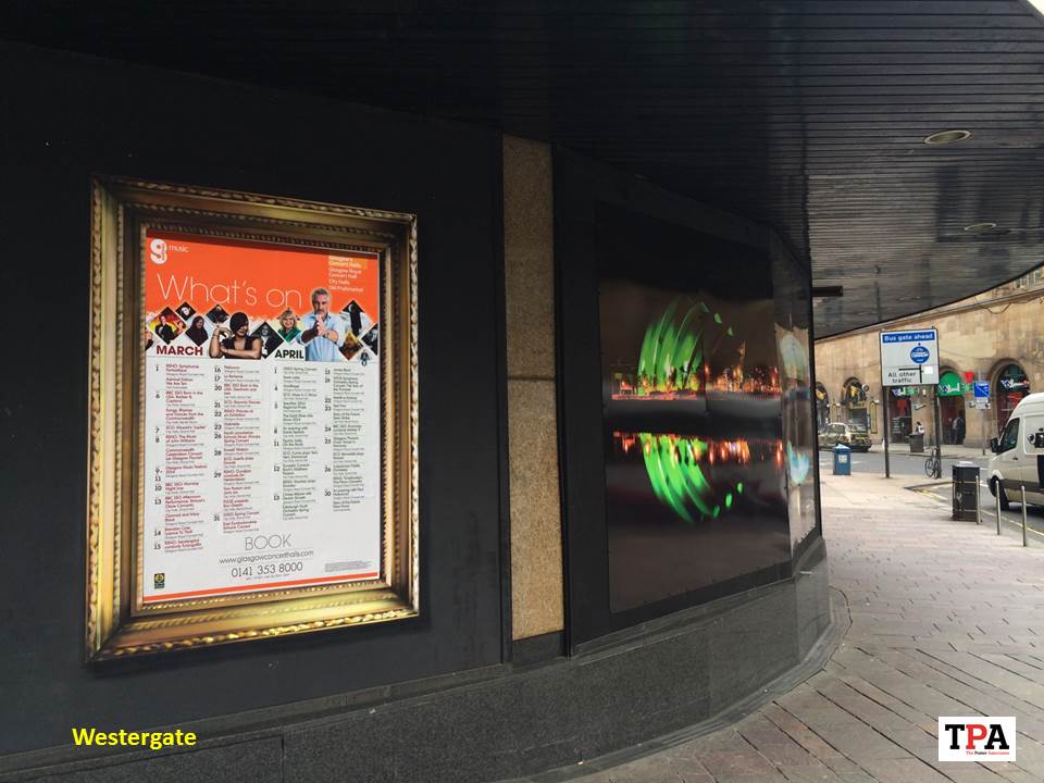 Civic imagery of iconic Glasgow performance venues,’The Hydro’ and ‘Armadillo,’ installed by TPA at a highly visible city centre vacant property to enhance the area whilst keeping tourists and local inhabitants informed of what’s on.